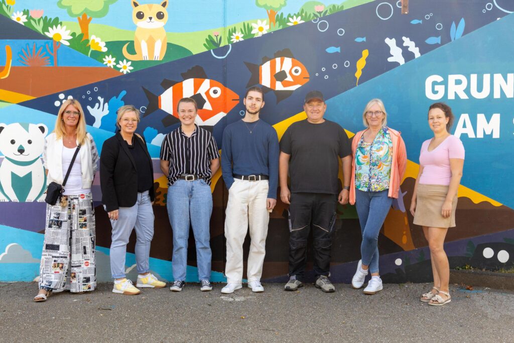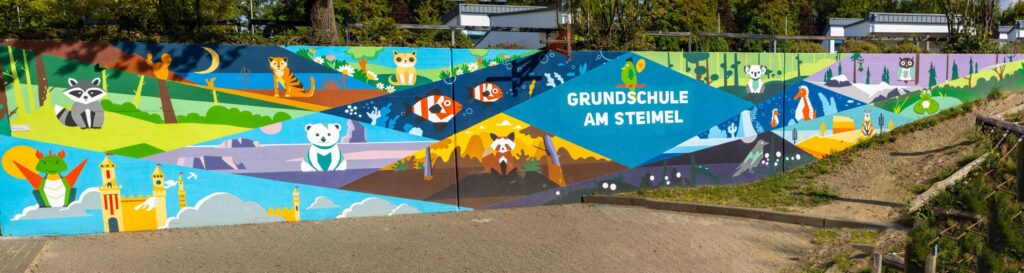 Schon lange wünschten sich die Schülerinnen und Schüler der Grundschule Am Steimel mehr Farbe für ihren Schulhof, ganz speziell für eine Wand, die den Schulhof begrenzt. Initiiert durch den Förderverein der Schule und mit finanzieller Unterstützung der Kreissparkasse Köln im Rahmen der „Hennef Stiftung” wurde dieser Traum dank der kreativen Design-Studenten der Rhein- Sieg-Akademie jetzt Wirklichkeit! Pünktlich zu Beginn des neuen Schuljahrs wurde das Kunstwerk in Anwesenheit der Schulleiterin Stephanie Kollatz-Block, Stiftungsreferentin Sabine Claßen von der KSK Köln-Stiftung, Katharina Schmidt als 2. Vorsitzende des Fördervereins, Schulpflegschaftsvorsitzende Anja Dósa, Hausmeister Joachim Decker und den Studenten Tim Krüger und Leonie Lamersdorf der Öffentlichkeit vorgestellt.