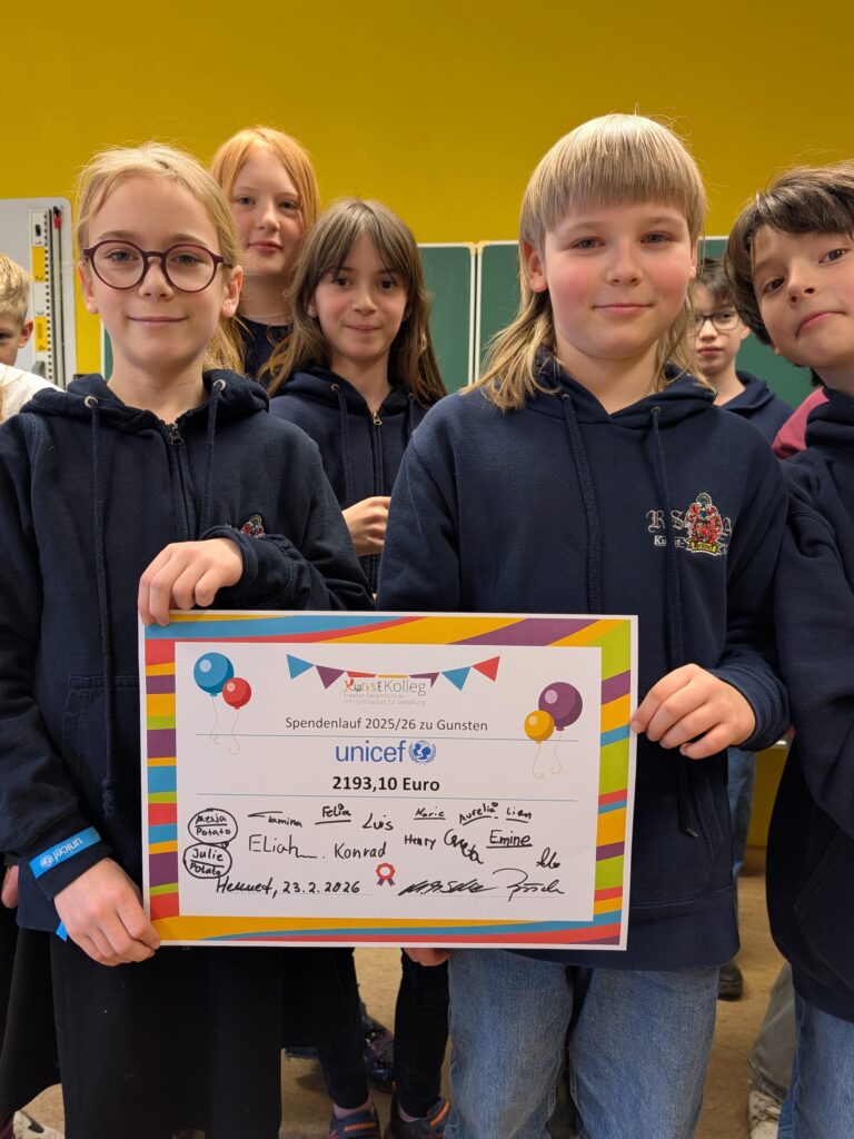 Im vergangenen September veranstaltete das KUNSTKOLLEG wieder einen Spendenlauf für den Guten Zweck! Alle Schülerinnen und Schüler hatten die Gelegenheit, möglichst viel Geld pro Runde „zu erlaufen“. Mit 375 Runden hatte Klasse 5a alle anderen hinter sich gelassen und überreichte jetzt den Spendenscheck an Frau Theile von der Bonner UNICEF-Arbeitsgruppe! Sie besuchte die Klasse 5a, um zu erklären, wofür das Geld verwendet wird. Ob für Schulbücher, Stifte, Notfallpakete, medizinische Versorgung – der Bedarf ist groß. Vielen Dank für den Besuch